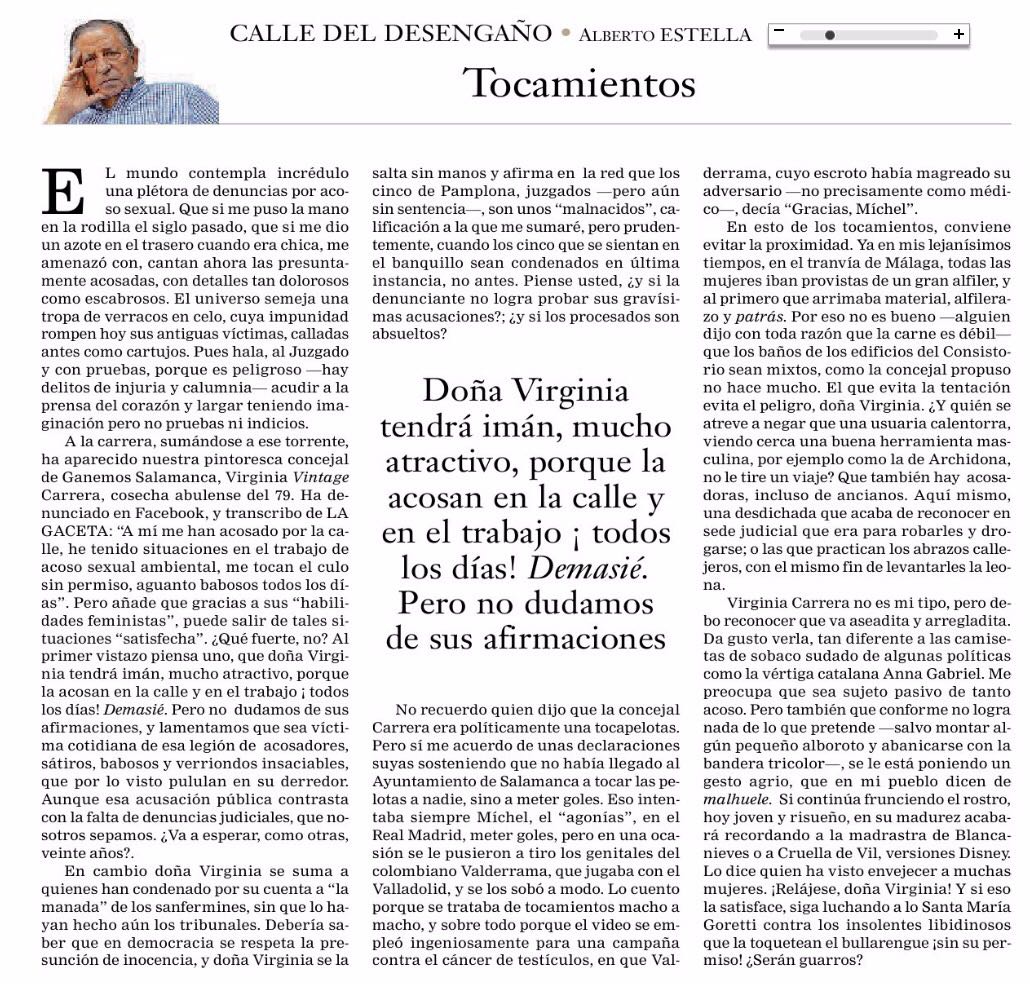 1. Gracias, me alegra saber que la asociación de periodistas salmantinos se desvincula de semejante artículo y se compromete a la prevención, sensibilización y erradicación de la violencia de género… El artículo de Estella no puede contener más violencia contra las mujeres. La libertad no debe ser confundida con libertinaje.